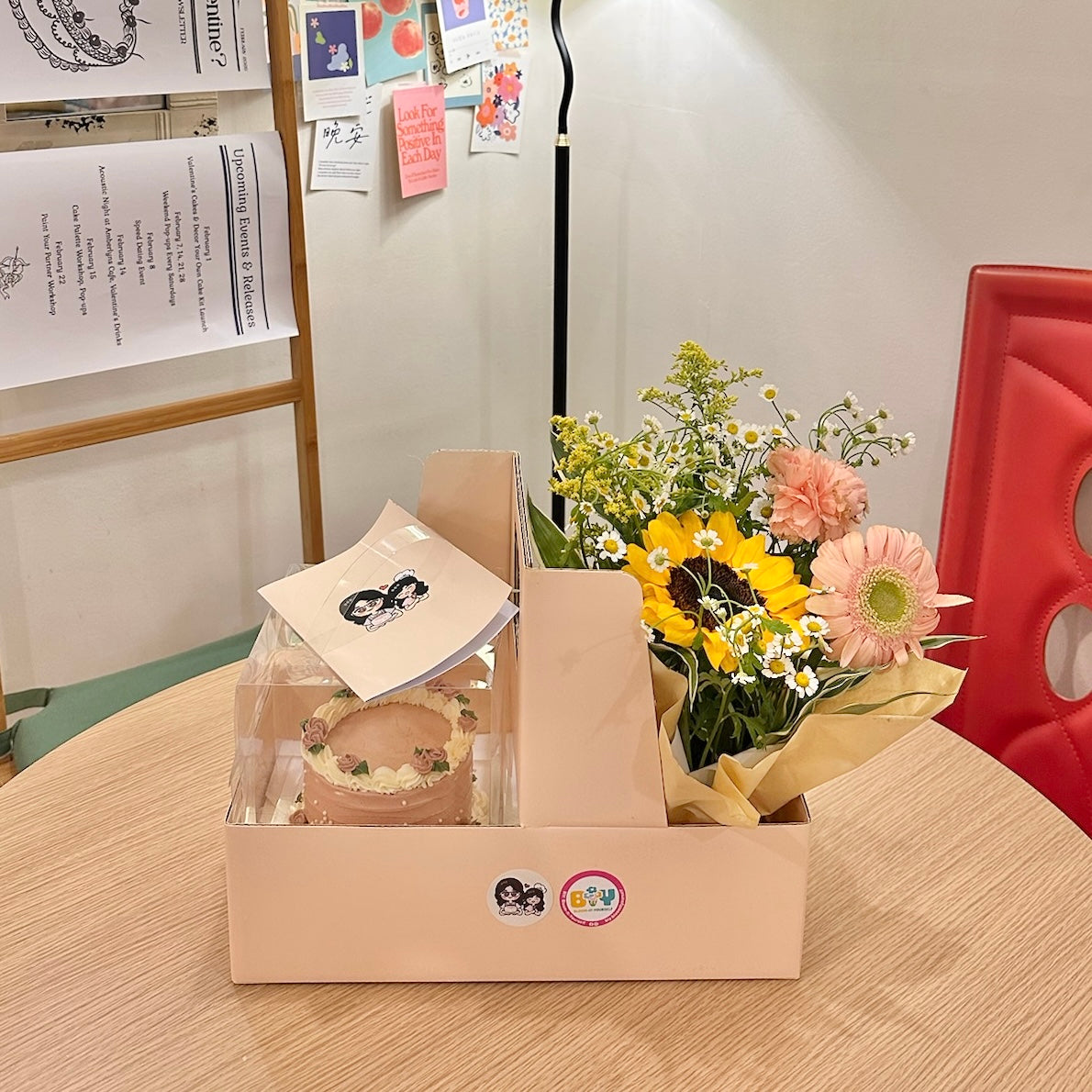 Comes with flower bundle and box ONLY. Cake is ordered separately from Valentine's Cake Collection.